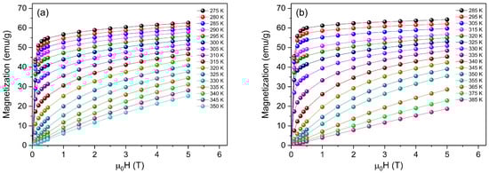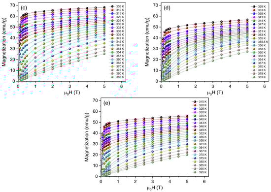 The isothermal magnetization curves at various temperatures near FM-PM transition under an applied magnetic field of up to = 5 T are presented in Figure 5. The magnetization of all samples increases rapidly at temperatures below , which implies a ferromagnetic state. On the other hand, the magnetization measured at temperatures higher than shows a linear tendency. This can be related to the thermal effect that ruins the ferromagnetic order of the samples, thus implying a paramagnetic state.