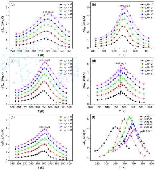 The values for the La0.8−xKxBa0.05Sr0.15MnO3 samples were calculated using Equation (7), and the results are presented in Figure 6. It can be noticed that the largest value for all samples occurred around the of each corresponding sample. The broad curves of all samples suggest that each sample exhibits a second-order phase transition nature []. The maximum values of the magnetic entropy changes at 5 T () were 4.21, 4.96, 5.18, 4.83, and 3.90 J/kg K for LKBS-0, LKBS-05, LKBS-10, LKBS-15, and LKBS-20, respectively. It is noteworthy to mention that according to Equation (7), the value of is directly controlled by the first derivative of magnetization with respect to temperature (dM/dT). Referring to the dM/dT graph shown in the inset of Figure 4a, it can be seen that the slope reveals an increasing tendency until it reaches a maximum value, which belongs to the LKBS-10 sample. This fact is in a good agreement with the comparison of maximum value at 5 T shown in Figure 6f which demonstrates that the largest value is shown by the LKBS-10 sample.