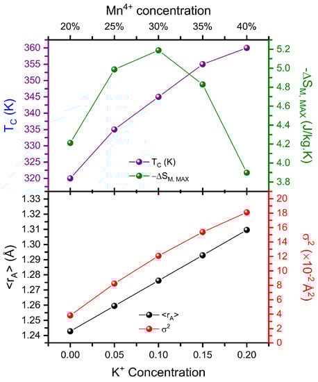 Currently, optimization in value is the main objective in research regarding the MCE property of LMO-based compounds. In LMO-based compounds, there are several factors that can be regarded as the reason behind the increase in the value. These factors are the Mn3+/Mn4+ ratio, average A-site ionic radius (), and A-site cationic mismatch (). According to previous research, the value of LMO-based compounds is expected to increase until the value of Mn3+/Mn4+ ratio reaches around 7/3 or 2/1 [,]. Beyond this ratio, the value is expected to decrease monotonously as Mn4+ content increases. Examples of this can be found in La1−xCaxMnO3 and La1−xSrxMnO3 [,]. On the other hand, there are several cases where value increases with the increase in and . Examples of this can be seen in La0.6Ca0.4−xSrxMnO3, La0.7−xDyxCa0.3MnO3, and La0.5Ca0.5−xPbxMnO3 [,,]. However, special consideration is needed when dealing with a more complex LMO-based compounds, especially potassium (K+)-substituted LMO-based compounds. This is due to the fact that monovalent ion converts twice the amount of Mn3+ to Mn4+ ion and the fact that K+ ion has the largest ionic radius among monovalent ions, which is commonly substituted to LMO-based compounds [,,,]. There have been some cases where substitution of K+ ion increased the maximum value of LMO-based compounds. Examples of this can be seen in La0.7Sr0.2M0.1MnO3 (M = Na, K), La0.7M0.2M’0.1MnO3 (M = Sr, Ba and M’ = Na, Ag, K), and La0.75Ba0.1M0.15MnO3 (M = Na, Ag, and K) [,,]. On the other hand, there have been several cases where substitution of K+ ion reduced the maximum value of LMO-based compounds. Examples of this can be seen in La0.8Ag0.2−xKxMnO3 and La0.65M0.3M’0.05MnO3 (M = Ba, Ca and M’ = Ba, Ag, K) [,]. The mentioned results show that the main factor behind the evolution of value in K+ ion substituted LMO-based compounds is still open to debate.