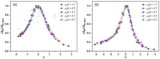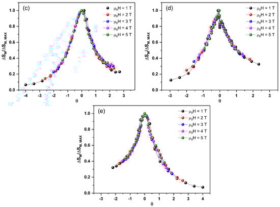 To support the previous argument whereby all of the La0.8−xKxBa0.05Sr0.15MnO3 samples belong to the second-order phase transition type, a universal master curve based on the phenomenological approach proposed by Franco et al. was constructed []. According to Franco et al., the measured as a function of temperature under different applied magnetic fields will coincide with a single master curve for a material with second-order phase transition. In detail, this approach was carried out by normalizing magnetic entropy change to its maximum value for each applied magnetic field. Additionally, the temperature axis needs to be modified by rescaling the temperature with new variable , defined by the following equation: