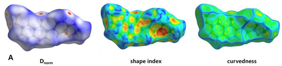 (A) Hirshfeld surfaces mapped with dnorm, shape index and curvedness. (B) Deep red spots on the dnorm surface represent close contact interactions with other molecules by dimeric linkage and H-bonds.