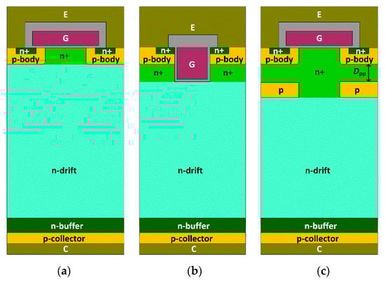 Schematic cross-sections of (a) SiC planar insulated-gate bipolar transistor (IGBT) (P-IGBT), (b) the SiC trench IGBT (T-IGBT), and (c) the new SiC planar IGBT with buried p-layers (BP-IGBT).