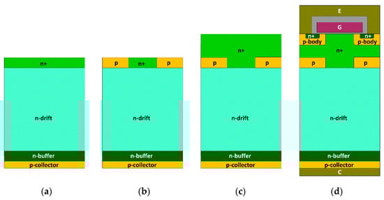 The fabrication method of the proposed BP-IGBT is similar to the P-IGBT, except for the buried p-layers. A proposed fabrication process flow is shown in Figure 2. After growth of the drift layer and n+ layer, the buried p-layers can be formed by ion-implantation. Then, a second n+ layer is regrown. The surface structure can be formed in the same way as a traditional SiC IGBT, which includes implantation for the p-body and n+-emitter region, formation of the MOS-structure, contact holes for the emitter, and metallization. For SiC technology, formation of buried p-layers is a practically viable process, and has been reported in literature [16,17]. Therefore, the proposed structure in this paper is a technically feasible solution for the SiC IGBT.