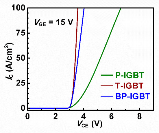 Figure 4 plots the forward IC–VCE characteristics of the SiC IGBTs. The VON of the proposed BP-IGBT is only 3.6 V, close to the 3.4 V of the T-IGBT. This is because the BP-IGBT obtains an enhanced conductivity modulation induced by the heavily doped n+-region at the top side. The P-IGBT suffers a much higher VON of 5.2 V as the grounded p-body extracts holes around it.