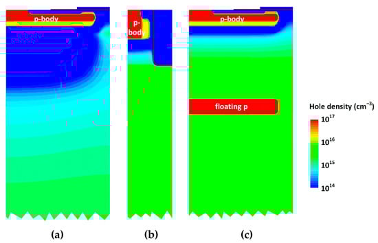 The enhanced conductivity modulation in the BP-IGBT and T-IGBT can be evidenced by the hole density, as is displayed in Figure 5. At the lower side of the IGBTs, all of them exhibit a similar hole density distribution. At the topside, the BP-IGBT obtains a high hole density to the same level of the T-IGB, while the P-IGBT shows an obviously decreased hole density. The grounded p-body in the P-IGBT presents a low barrier for holes, and thus quickly extracts holes and causes a low hole density. For the T-IGBT, the protruded trench gate creates an energy barrier for the holes and screens the p-body from extracting holes, which leads to a high density of holes at the topside of the device. For this purpose, a small cell size of the T-IGBT is preferable since the p-body is better screened by the gate [9,18,19]. For the proposed BP-IGBT, the n+-region under the p-body creates an energy barrier for holes, and also results in a high hole density.