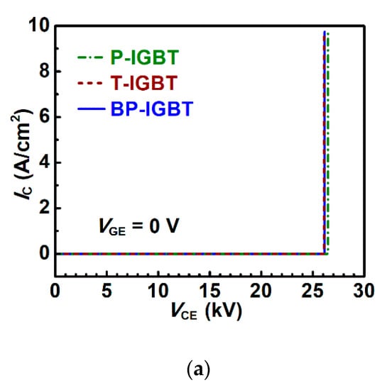 The BV capabilities under VGE = 0 V are plotted in Figure 6a. All the studied SiC IGBTs exhibit a nearly same BV of ~26.5 kV. The BV is mainly determined by the thickness and doping of the n-drift region. The difference in the top structure just slightly changes the BV. In the P-IGBT and T-IGBT, the BV is supported by the PN junction below the p-body. While in the proposed BP-IGBT, the BV is mainly sustained by the p-shield/n-drift junction, as the n+-layer below the p-body is depleted under a small voltage. For the SiC planar IGBT with only the n+-region but no buried p-layer, the BV is less than 2 kV as the n+-region tends to increase the electric field at the p-body/n junction. The buried p-layer can overcome the problem caused by the n+-region, so a low VON and a high BV can be simultaneously obtained in the BP-IGBT.
