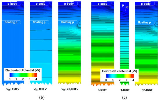 Figure 6b further depicts the process in the BP-IGBT using potential contour. With the rise of VCE, in the beginning, the voltage is first supported by the PN junction below the p-body, as shown in Figure 6b (VCE = 450 V). When the n+-region is depleted, the potential of the buried p-layer is clamped, and the rest of the voltage is supported by the PN junction below buried p-layers, as shown in Figure 6b (VCE = 800 V and VCE = 20,000 V). This analysis also explains the dependence of BV on Dpp in Figure 3. Therefore, the blocking mechanism of the BP-IGBT is different to the conventional P-IGBT and T-IGBT. As shown in Figure 6c, in the conventional IGBTs without buried p-layers, the p-body/n junction and/or MOS junction support the whole off-state voltage. The electric field is highest near the p-body/n junction, and/or MOS junction, where the equipotential lines are most crowded.