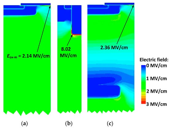 The gate oxide field distribution in the off-state of the SiC IGBTs are displayed in Figure 7. As the gate protrudes downward, the T-IGBT suffers an extremely large oxide field (Eox-m) of ~8 MV/cm, which presents a serious threat on the device’s long-term reliability [20]. In this study, the radius of the gate trench corner is 0.2 µm. The maximum oxide field (Eox-m) of the T-IGBT is dependent on the shape of the trench corner. With the radius of the trench corner changing from 0.1 µm to 0.5 µm, the Eox-m reduces from 9.76 MV/cm to 7.58 MV/cm. Therefore, a rounded trench corner helps to relieve the electric field stress in the gate oxide, but cannot overcome this problem. While in the P-IGBT and the proposed BP-IGBT, the planar-gate structures help to decrease the Eox-m to a safe level of below 3 MV/cm.
