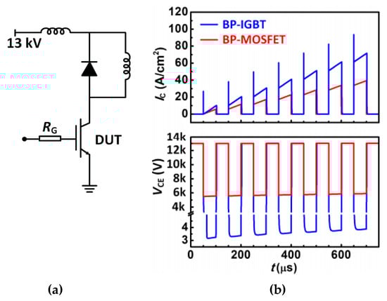 Introducing floating p-layers in the unipolar SiC MOSFETs is found to cause a storage of negative charges and a degradation of dynamic VON [21,22]. But for IGBTs with bipolar conduction, the stored negative charges in the off-state can be neutralized in the following on-state, by the holes injected from p-collector. The dynamic VON characteristics of the BP-IGBT are also studied in this paper and are shown in Figure 8. Mixed-mode TCAD simulations are utilized. The schematic circuit used for switching characteristics is shown in Figure 8a. The supply voltage is 13 kV. The stray inductance is assumed to be 10 nH in the power loop. The chip area of the device under test (DUT) is set to be 1 cm2. To turn the device on and off, the gate to emitter voltage is switched between +15 V and −5 V.