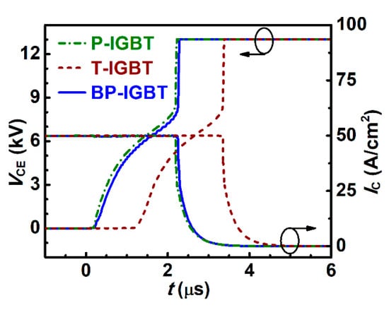 The multi-cycle switching waveforms are plotted in Figure 8b. For comparison, the dynamic VON characteristics of the corresponding SiC MOSFET (BP-MOSFET) are also studied. The BP-MOSFET is designed for the same voltage rating as the BP-IGBT by replacing the p-collector with the n-drain. For the BP-MOSFET, when the device experiences a high voltage in the off-state, the buried p-layers support a large portion of the voltage, and the p-layers become negatively charged. When the device returns to the on-state, the negative charged p-layers possess a negative potential, and the negative charges cannot be released through the negatively biased PN junctions. Therefore, the negative charges lead to an expansion of depletion regions, which significantly impedes the current flow and results in a VCE as high as 5.5 kV [21,22]. The BP-IGBT is a bipolar device. For the BP-IGBT, when it returns to the on-state, the large amount of positively charged holes can quickly eliminate the negative charges in the buried p-layers. Therefore, the BP-IGBT does not suffer degraded dynamic VON. The VON at IC = 50 A/cm2 in this Figure 8b is the same as the static condition in Figure 4.