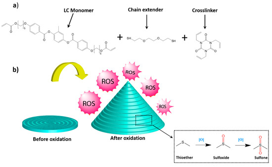 Herein, we report the synthesis and characterization of thioether based, ROS-responsive LCEs using a previously described two-stage, one-pot, thiol–ene reaction scheme. We report, for the first time, that these stimuli-responsive materials undergo programmable shape change when exposed to ROS (Figure 1b) [44]. These LCEs are capable of resisting diffusion of water molecules in the polymer network in aqueous environments. However, the incorporation of thioether linkages in the network renders these LCEs sensitive to oxidants, and the hydrophobic thioether groups are able to convert to polar sulfoxide and sulfone groups in response to the chemically reactive species. Oxidation of the LCEs results in the increased overall polarity of the system and, consequently, higher swelling in water. LCEs with programmed molecular orientations exhibit anisotropic swelling in such conditions, resulting in interesting mechanical changes. The eventual breakdown of the LCE polymer network due to polymer chain scission results in the fracture of the films into many small pieces.