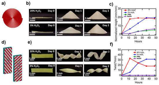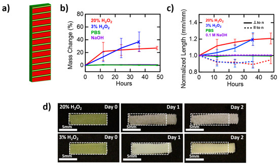 The oxidation of 3D LCE structures with a programmed molecular order leads to anisotropic shape change. Uniaxial strips were printed with print paths set along the short axis of the rectangular strips (Figure 2a). For quantitative assessment of anisotropic shape change, dimensional and mass changes in the strips were measured over time. Uniaxial strips showed a 21% increase in mass after being in 20% H2O2 for just 12 h, while samples immersed in 3% H2O2 showed a 13% increase in mass (Figure 2b). A very slight mass change was observed in the strips that were in either control or basic solutions with 0.3% for PBS and 1% for NaOH over a period of 48 h. These trends in the mass changes corresponded with the dimensional changes observed (Figure 2c,d). After being in 20% H2O2 for 24 h, uniaxial strips showed a decrease in width of 8% and a 16% elongation. After being in 3% H2O2 for 24 h, strips similarly decreased in width (along the director) by 10%. Strips also elongated by 9%. The swelling of the polymer network is thought to result in the nematic to isotropic transition in the uniaxial strips. As a result, the strips contract along the short axis or parallel to the nematic director but elongate along the long axis or perpendicular to the nematic director. Similar macroscopic deformations through anisotropic swelling have been previously reported in LCEs responding to solvents, where contraction along the nematic director and expansion perpendicular to the director can be observed [48,50,51]. No dimensional changes were observed in the strips that were in either PBS or NaOH solution. Because the LCE with the thioether groups is inherently hydrophobic, the shape change exhibited by the LCE is not due to simple water uptake in an aqueous environment, but due to swelling induced by the presence of oxidants and the introduction of hydrophilic moieties in the polymer network. The solubility switch also leaves the LCEs highly susceptible to degradation, both oxidative and hydrolytic, leading to their fracture into many small pieces after a week of being in the oxidative media. Figure S1 (see Supplementary Materials) shows a uniaxial strip after 5 days of being in the media, which was the last day the samples could be reliably removed from the vial.