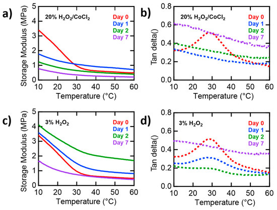 The effects of degradation can be clearly observed on the viscoelastic properties of the LCE. To measure these properties, DMA was performed on polydomain films in water after removal from the degradation solution. After oxidation in 20% H2O2 for a day, the LCE demonstrates a drop in the rubbery modulus (E′) from 3.4 MPa to 1.7 MPa at 10 °C (Figure 3a, Figure S2a). This temperature is well above the glass transition temperature for these films, which is around −25 °C. After oxidation, samples also exhibited a lack of peak in tan delta which could be observed in LCEs at around 30 °C, prior to oxidation (Figure 3b, Figure S2b,d,f). This peak likely corresponds to a smectic to nematic mesophase transition [44], and its disappearance demonstrates the order disruption induced by the degradation and swelling. On Day 7, the rubbery modulus dropped to 0.8 MPa at 10 °C (Figure 3a, Figure S2e). Tan delta is highest for films on Day 7, which suggests an increase in viscoelastic behavior and further signifies the degradation of the films on Day 7 (Figure 3b, Figure S2f). Films in 3% H2O2 exhibited similar trends of oxidation and degradation but at a slower rate compared to those in 20% H2O2, with significant degradation only taking place on Day 7 (Figure 3c,d, Figure S3). Degradation was again characterized by a drop in rubbery modulus, increase in tan delta and a gradual disappearance of the tan delta peak. Alternatively, films that were subjected to either PBS or NaOH solution showed very little change in mass or thermomechanical properties over the same period of time (Figure S4a–d). We note that samples for dynamic mechanical analysis were polydomain samples and were thicker than the aligned films discussed in Figure 2. The degradation behavior of these thicker materials followed similar trends to the thinner materials but they occurred over a longer time period. (Figure S4e). These thermomechanical data suggest that oxidative conditions lead to the disordering of the polymer network and a reduction in crosslinking that is characteristic of degradation.