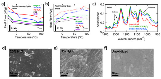 The degradation of the LCEs in oxidative media is characterized by the formation of sulfoxide and sulfone functional groups from the thioether groups present after synthesis. All test specimens subjected to oxidative environments showed an increase in glass transition temperatures (Tg) as well as appearance of a mesophase transition (Figure 4a) after drying. After processing, the Tg of the LCE is −25 °C and the nematic–isotropic transition is difficult to detect, as expected in elastomers crosslinked in the nematic phase. Films oxidized in 20% H2O2 and then dried showed a Tg at 8 °C. This increased Tg is expected as the flexible thioether groups are converted to more rigid and polar sulfoxide and sulfones [55]. The oxidized and dried materials also exhibit a low enthalpy (3.3 J/g) endothermic transition at 87 °C on heating. The low enthalpy (3.3 J/g) and low hysteresis (4 °C), as determined from comparing the first cooling cycle (Figure 4b) with the second heating cycle, indicates that this endothermic transition is likely a mesophase transition from nematic–isotropic [43,54]. The appearance of this mesophase transition suggests that regions of the film are no longer crosslinked and thus show typical mesophase–isotropic phase transitions on heating. Similarly, films in 3% H2O2 also exhibited an increased Tg (−9 °C) and a mesophase transition at 94 °C after degradation and drying. Films that were in control solutions showed no change in transitions temperature compared to the untreated LCE specimens. Fourier transform infrared spectroscopy (FTIR) further confirmed the presence of polar groups in the network after oxidation (Figure 4c). The appearance of sulfoxide absorption peaks are observed in oxidized samples at 1037 cm−1 and sulfone peaks at 1276 cm−1 and 1315 cm−1 [55,56]. SEM analysis of films before and after oxidation showed effects of oxidation on surface topography. Physical degradation could be seen on the surface of samples that were oxidized in 20% and 3% H2O2 (Figure 4d,e). The oxidized sample had a rough, uneven surface, while the surface of the unoxidized sample was relatively smooth (Figure 4f).