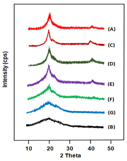 XRD patterns of PE-VOL, PD,L-LGA and PE-VOL/PD,L-LGA blend with different PE-co-VAL contents: (A) neat PE-VOL; (B) neat PD,L-LGA; (C) PE-VOL/PD,L-LGA10; (D) PE-VOL/PD,L-LGA25; (E) PE-VOL/PD,L-LGA50; (F) PE-VOL/PD,L-LGA75; and (G) PE-VOL/PD,L-LGA90.