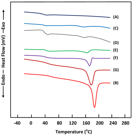 Heating DSC thermograms of copolymers and their blends with different PE-VOH contents: (A) neat PD,L-LGA; (B) neat PE-VOL; (C) PE-VOL/PD,L-LGA10; (D) PE-VOL/PD,L-LGA25; (E) PE-VOL/PD,L-LGA50; (F) PE-VOL/PD,L-LGA75; and (G) PE-VOL/PD,L-LGA90.