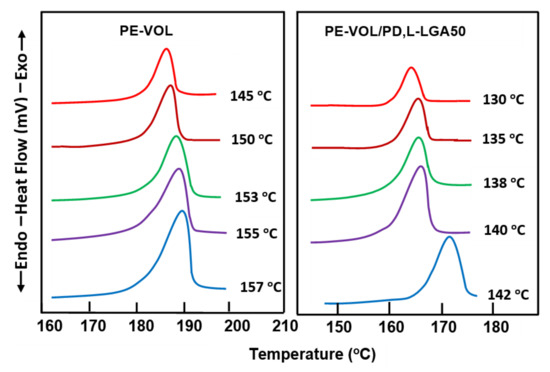 Subsequent melting behaviors of PE-VOL and PE- VOL/PD,L-LGA50 blend isothermally crystallized at the indicated crystallization temperatures.