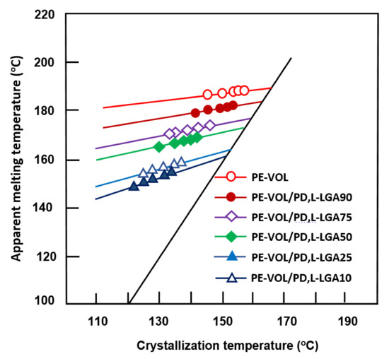 The isothermal crystallization process of pure semi-crystalline copolymer and in its blends were realized at different crystallization temperatures, and results obtained for the neat PE-VOL and the PE-VOL/PD,L-LGA containing equal ratio of each component are plotted in Figure 3. Based on the variation of the apparent melting temperature, Tm, versus the crystallization temperature, Tc it was possible to deduct relative to the pure PE-VOL and that in their blends as presented in Figure 4 for the neat PE-VOL and PE-VOL/PD,L-LGA50 system with equal ratios of each component. Indeed, straight lines were obtained and and are deduced from the slope of the Hoffman–Weeks plot and the intercept of these curves with the straight Tm = Tc, respectively. It is important to note that the value varied between zero and the unity. This parameter is used to estimate the stability of molten crystals. Indeed, when the value is close to zero this indicates that the crystals is in its maximum stability and when this parameter is close to one this indicates that this crystals is in its instability state. and η values for pure PE-co-VAL and in the blends are listed in Table 4.