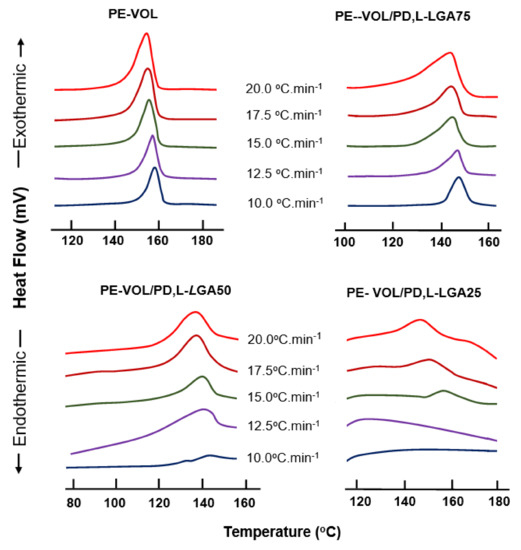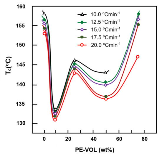 where represents the apparent latent heat of crystallization of PE-VOL in the blend and the extrapolation of the latent heat corresponding to the melting of PVA 100% crystalline. Note that the taken from the literature has an average value of 157.8 J·g−1 [59] φ is the mass fraction of the amorphous copolymer (PL-co-GA) incorporated in the blend. The values for PE-VOL and PE-VOL/PD,L-LGA blend with different PE-VOH contents obtained from this equation are gathered in Table 4. Figure 7 shows the effect of the dispersion of PD,L-GLA in the blend on the non-isothermal crystallization kinetics of PE-VOL in the blend. As can be seen from these thermal curve profiles, the peak of the crystallization enthalpy is lower when the PD,L-LGA content in blend was 10 wt %. On the other hand, as in case of the neat PE-VOL, it was observed that, for all blend compositions, the value of PE-VOL slowly shifted toward the lower temperatures as the cooling rate increased. This phenomenon was also revealed by different investigators [60,61,62] and attributed this fact to a reduction of chain mobility and flexibility limiting the time of diffusion inside the crystalline lattice of the PE-VOL matrix. This fact leads to reduce the crystallization rate of the semi-crystalline copolymer in the blend. Indeed, when the blend samples are cooled down at relatively high cooling rates, the movement of PE-VOL chains do not seem to follow the cooling temperature regime imposed over time due to the influence of thermal hysteresis, which leads to a lower maximum crystallization temperature. When incorporated into the PE-VOL matrices, the macromolecular chains of PD,L-LGA act as an energy barrier preventing heat transfer to the PE-VOL chains. Therefore, at a high PD,L-LGA content in the blend, the crystallization process occurs at a relatively low temperature.