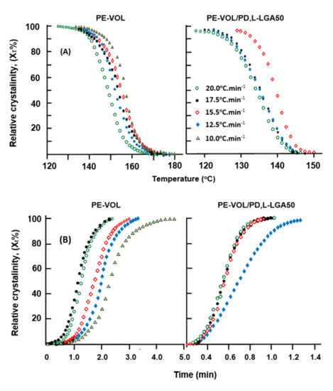 Typical plots of the variation of the relative crystallization degree of neat PE-VOL and PE- VOL in the blend as function of temperature, , and time, , are obtained during the non isothermal crystallization process and the curves of pure PE-VOL and PD,L-LGA/PE-VOL50 taken as examples are presented in Figure 8A,B, respectively. Sigmoid pattern was obtained for each sample and the rate of the crystallization deducted from the slope is almost constant between 20% and 80% of the relative crystallinity and due to the spherulite impingement effect, these curve profiles tend to become flat beyond [58].