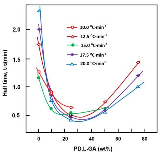 The half time, t1/2, of the crystallization process was deducted from the curves of Figure 8B at 50% of the relative crystallization of pure PE-VOL and PD,L-LGA/PE-VOL systems and the data obtained are plotted in Figure 9. For the pure PE-VOL, in general these curve profiles reveal an increase in the t1/2 with increasing the cooling rate. On the other hand, when the PD,L-LGA was incorporated in the PE-VOL matrix the t1/2 passed by a minimum at 30 wt % of this amorphous copolymer in the blend. Indeed, the crystallization process of PE-VOL in the blend was dramatically decelerated when the PD,L-LGA content was 30%, in which the t1/2 loses 45% – 83% of its value depending on the cooling rate. This observation can be explained by the fact that at a relatively low PD,L-LGA content, the macromolecular chains of this last copolymer cluster cannot restrict the motion of the PE-VOL macromolecular chains but act as heterogeneous nucleating agents during the non-isothermal crystallization process and therefore accelerate the crystallization. At a higher PD,L-LGA content, the macromolecular chains of PD,L-LGA clusters act as a barrier that restricts the thermal motion of PE-VOL macromolecular chains and therefore retards the formation of crystals. As a result, the addition of a large amount of PD,L-LGA can delay the overall crystallization process.