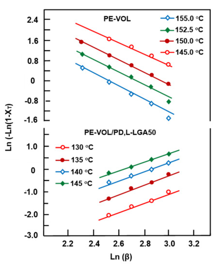 Among many models that have been developed to investigate the non-isothermal ctystallization kinetics [64,65,66,67] the Ozawa Equation (9) extended from that given by Avrami Equation (10) [68] is adopted in this work to study the non-isothermal crystallization kinetics of the PE-VOL/PD,L-LGA blend and its pure semi-crystalline component.