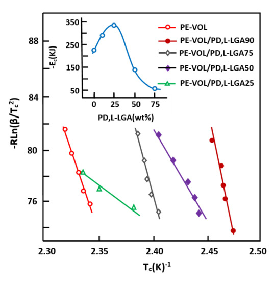 where R and are the gas constant and the peak crystallization temperature, respectively. is obtained from the slope of the plots Rln(β/Tc2) versus 1/T of Figure 11. The curve (on the top) indicating the variation of the crystallization activation energy versus the PE-VOL content showed that the passed by a maximum at 337 ± 12 Kj when the PE-VOL content in the blend was 75 wt %. The increase in can be explained by the increase in the miscibility of PE-VOL/PD,L-LGA system because increasing the PD,L-LGA in the blend results in dilution of PE-VOL chains at the crystal growth front and contributes to the reduction of mobility of PD,L-LGA chains due to the higher Tg of the blend than that of pure PE-VOL, thus a higher value for PE-VOL crystallization occurs in the blends.