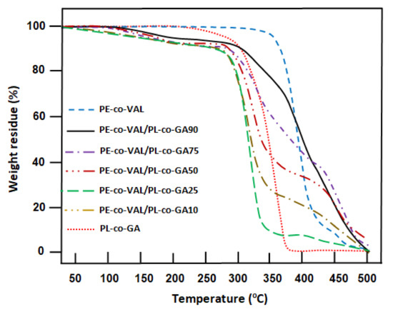 Thermograms TGA of pure PE-VOL, PD,L-LGA and their blends with different compositions.
