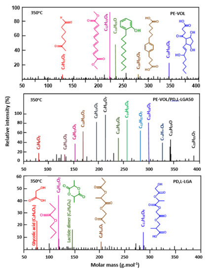 The principal fragments resulting from the isothermal decomposition of PE-VOL, PD,L-LGA and PE-VOL/PD,L-LGA50 blend carried out by DART-ToF-MS analysis at 350 °C, selected from the previous TGA analysis as temperature where pure components and blends decompose, are illustrated in Figure 13. The predominant fragments regenerated from the decomposition of the neat PD,L-LGA were the isomers of C6H12O2, glycolic acid monomer(C2H4O), lactide dimer (C6H8O4) and the isomers of C11H16O9 formed from fragmentation of polymeric chains followed by a rearrangement and transposition through a complex radical mechanism. On the other hand, the decomposition of neat PE-co-VOH led to the production of a significant amount of C12H15O2 containing several conjugated double bonds resulting from the water elimination of this copolymer. In contrast, the spectrum of the decomposition involving the two copolymers in the blend is completely different. Indeed, the comparison of the spectrum visualizing the resulting fragments of the decomposition of the blend with those of the neat components reveals no signals common attributed to those observed in the spectra of the two pure components. This result is probably due to inter-transposition of radical groups from one chain to another neighboring chain of different natures. Such phenomenon is generally favored in certain conditions such as the miscibility of the blend, decomposition temperature, and interaction forces between the different polymer chains such as hydrogen bonding (carbonyl-hydroxyl groups). This action can only be possible when the two different copolymers are distributed in the matrix of one in the other +on their molecular scale. This finding may provide additional evidence confirming the miscibility of this blend. Indeed, the DART-ToF-MS spectrum of the PD,L-LGA/PE-VOL50 blend shows a series of chain fragments in which the principal components are aliphatic and aromatic isomers of C10H16O2, C8H19O5, C7H16O7, C14H24O4, C16H18O5, C10H16O2, and C12H27O7. Small molecules resulted from elimination reactions such as water and CO2 were also produced, which do not appear on this spectrum. However, neither the monomer nor dimer and oligomers are among the decomposition products of the blend.