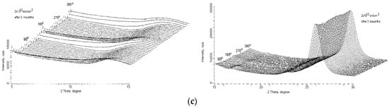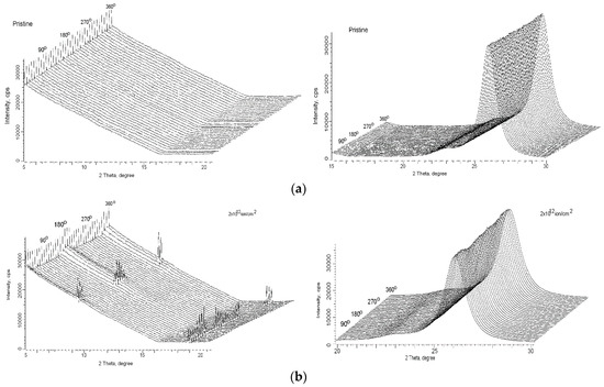 All of the diffraction rings described above have azimuthal distributions of intensities consisting of rings on which long or short arcs with variable intensity are superimposed. The diagrams in Figure 3 show that there is some symmetry in the peak azimuthal intensities in the polar coordinate system (2θ,φ). After irradiation, there is a clear oblique cross located predominantly along lines at angles of π/4 with respect to the direction of the texture. After aging the picture is more complicated but still contains some cross-like symmetries. Such X-ray diffraction patterns are typical of solid polymer materials consisting of chain molecules coiled in spirals, in which rings due to the polycrystalline character of the material are superimposed with arcs due to the spiral configuration of the chain molecules [22,25,26].