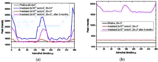 Diagram showing peak azimuthal intensities in the polar coordinate system (2θ,φ): (a) after irradiation and (b) after 3 months.