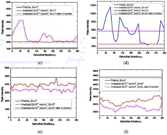 Azimuthal variations in the intensity of diffraction reflections after irradiation with a dose of 2 × 1012 ions/cm2 (red lines), and after aging for 3 months (pink lines). Pristine behavior (black lines) is included for reference: (a) 2 θ = 9–10°; (b) 2 θ = 13°; (c) 2 θ = 17°; (d) 2 θ = 19°; (e) 2 θ = 23°; (f) 2 θ = 26°.
