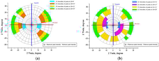 More details about azimuthal variations of all structural parts of the obtained X-ray diffraction patterns are shown in Figure 2.