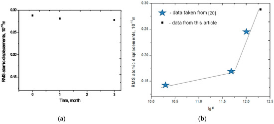 (a) Temporal dynamics in RMS displacement of the sample irradiated with a dose of 2 × 1012 ions/cm2 and (b) RMS displacement immediately after irradiation for four fluences between 5 × 1010 and 2 × 1012 ions/cm2 (data for the first three taken from [20]).
