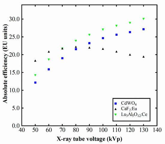 The variation of the CdWO4’s LE with X-ray energy is shown in Figure 1, for X-rays from 50 to 130 kVp. Results were compared with data for CaF2:Eu and Lu3Al5O12:Ce crystals (10 × 10 × 10 mm3) [46,47]. The LE values showed a tendency to increase, with both CdWO4 and Lu3Al5O12:Ce crystals within the examined energy range following a similar trend. However, for the examined samples (preparation method, impurity levels, etc.), CdWO4 values were in all cases lower than those of Lu3Al5O12:Ce, from 9.65% to 16.95%. On the other hand, CaF2:Eu showed a plateau at 80 kVp (luminescence efficiency equal to 22.22 Efficiency Units-E.U.) and decreased thereafter. This may be explained by taking into account the effect of significant and continuous decrease of the absorption efficiency of this material with increasing peak voltage. This in turn is due to the low density and low effective atomic number of CaF2:Eu resulting in low light yield, when interacting with higher energy photons [46,61].