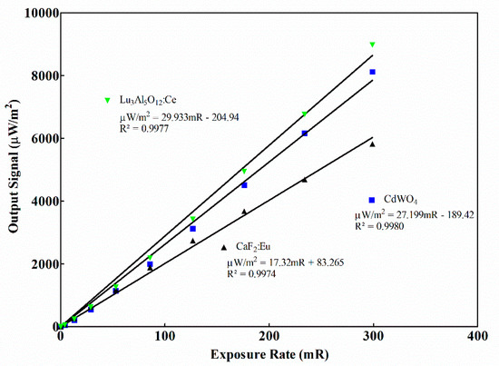 Figure 2 shows the light output curves of CdWO4, CaF2:Eu, and Lu3Al5O12:Ce single crystals, relating the light output signal with the incident X-ray exposure rate. A linear response can be depicted between the output LE and incident exposure in the examined range of exposures, with R2 values higher than 0.9974 in all cases. The three curves followed the same trend with the luminescence efficiency results, in which CdWO4 showed high light output values across the examined range, close to those of Lu3Al5O12:Ce.