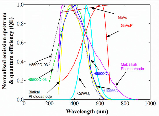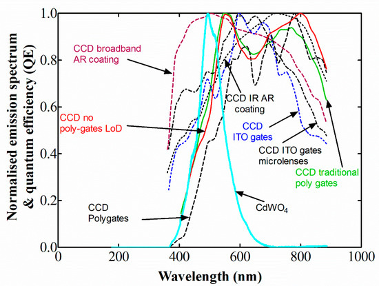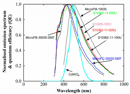 Light spectrum of CdWO4 crystal along with the light sensitivity of various complementary metal–oxide semiconductors.