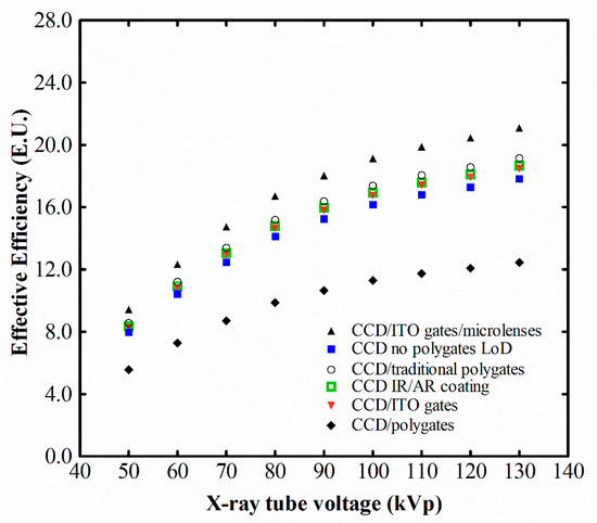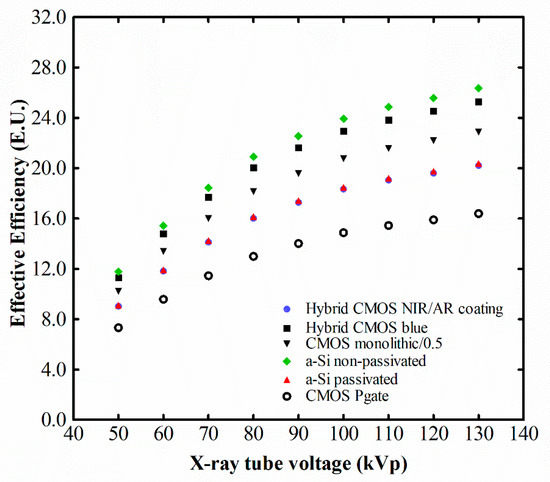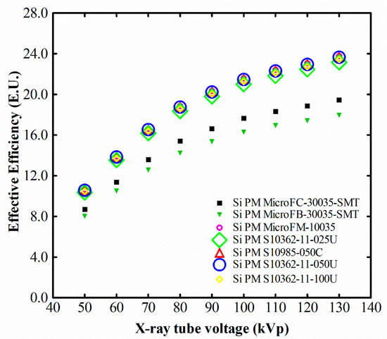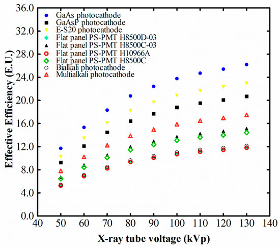 Figure 7, Figure 8, Figure 9 and Figure 10 show LE values of the CdWO4 as was effectively degraded by various optical detectors. These values are always less than the nominal light efficiency, since the matching of the light emitted by the examined crystals is registered differently by the various photodetectors due to their inherent light photon sensitivity. The optimum values for this study were obtained when CdWO4 was coupled with a CCD with broadband AR coating and with an a-Si:H (non-passivated) photodiode. When silicon, or flat panel position sensitive photomultipliers, bi- or multi-alkali photocathodes are used, having maximum detection efficiency in lower wavelengths (Figure 3, Figure 4, Figure 7, and Figure 8), CdWO4 shows higher SMF values, (ranging from 10.13% to 48.28%) compared to Lu3Al5O12:Ce. This in turn results in higher effective efficiency (EE), showing the importance of this factor when designing an optical detection system. In detail, the increase (with kVp) in the detected luminescence signal ranged from 26.47% to 34.91% when CdWO4 was coupled with the H10966A PS-PMT flat panel position sensitive photomultiplier, from 23.53% to 31.78% when CdWO4 was coupled with the bi-alkali photocathode, and from 8.52% to 15.55% when CdWO4 was coupled with the MicroFB-30035-SMT silicon photomultiplier, with respect to the corresponding values when these optical sensors were coupled to Lu3Al5O12:Ce [47].