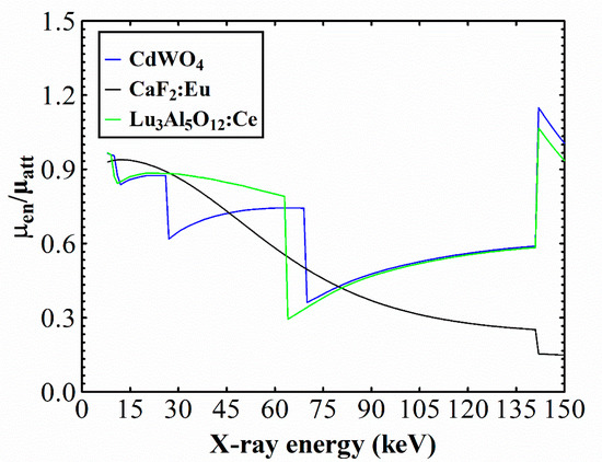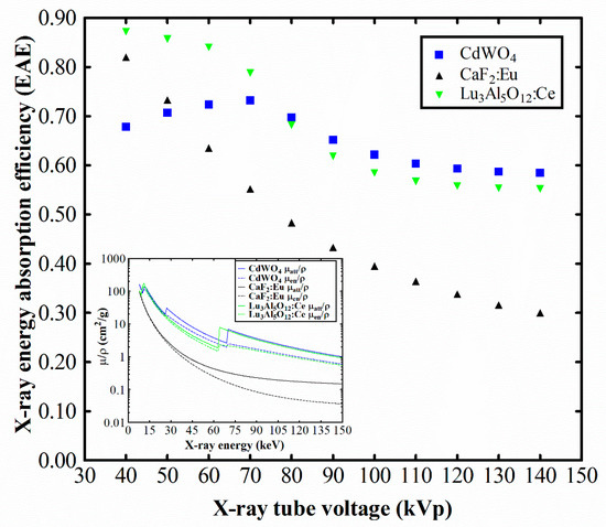 The differences between CdWO4 and Lu3Al5O12:Ce in the tube voltage range of 40–70 kVp (Figure 11) can be explained by taking into account the ratios of the mass energy absorption coefficients over the total mass attenuation coefficients that are used for the EAE calculation, see Equation (3) and Figure 12. This range corresponds to energies of about 34–51 keV. From Figure 12, it can be seen that in the 34–51 keV energy range, the ratio of the mass energy absorption over the mass attenuation coefficients for Lu3Al5O12:Ce is higher that the corresponding ratio of CdWO4, despite the fact that the absolute values of mass energy absorption and the mass attenuation coefficients of CdWO4 are higher in this range. Thereafter, the ratio of the coefficients for CdWO4 is higher than that of Lu3Al5O12:Ce, and this is reflected in EAE results of Figure 11. By contrast, CaF2:Eu starts with competitive values, in the low-energy range, but thereafter, the ratio of the coefficients is lower than for the other two materials, also resulting in lower EAE properties.