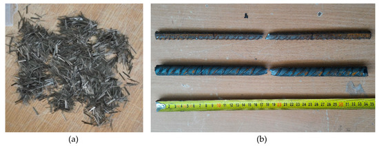 Superplasticizer CX ISOFLEX 793 (CEMEX Admixtures GmbH, Salzkotten, Germany) (Sp) based on polycarboxylate ethers was used in high dosage. The 12 mm lengths of chopped basalt fibers (Holtex, Rzgów, Poland) (BF) were used. The basalt fibre bundles are flat, approximately 1 mm wide and made of 13 μm diameter filaments. Other characteristics of the fibre were as follows: density 2.7 g/cm3, modulus of elasticity 70 GPa, tensile strength 1700 MPa and elongation at break 2.5%. The fibres used in this study are shown in Figure 1a. The ribbed bars, on which the bond strength was determined, were B500SP with diameters of 12 mm and 16 mm. Axial tensile tests were carried out on three specimens for each diameter of reinforcing bars (Figure 1b).