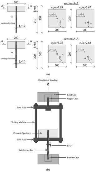 Two different types of deformed bars with nominal diameters of 12 mm and 16 mm were used in pull-out tested specimens. Seventy-two specimens in six series were produced and examined. All the specimens were cast parallel to the steel bar fixed vertically in the mould according to the pre-adopted position of the bar. Thirty-six specimens were made for each bar using six different basalt fibre contents of 0%, 1%, 1.25%, 1.5%, 1.75% and 2%. There were three specimens for each combination of cy/ϕb and fibre content. The ratios of the side cover to the bottom cover of the concrete (cx/cy) were 1 and 2.1. The details of the pull-out test specimens and test set-up are shown in Table 3 and Figure 2.