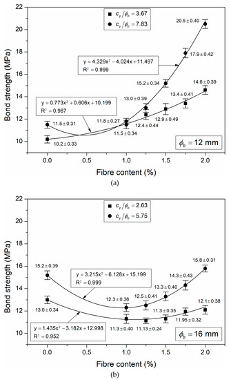 Variation in bond strength with fibre content for different bar diameters ϕb and relations cy/ϕb (a) 12 mm, (b) 16 mm.