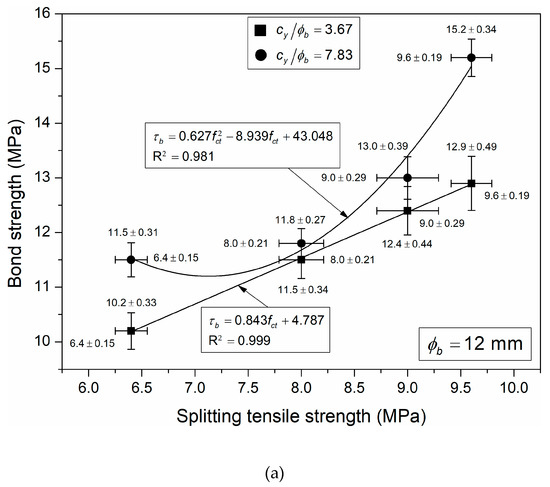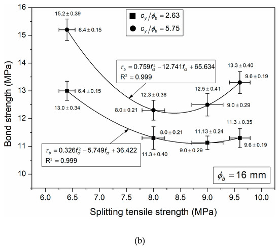 Variation in bond strength with splitting tensile strength for different bar diameters ϕb and relations cy/ϕb (a) 12 mm, (b) 16 mm.