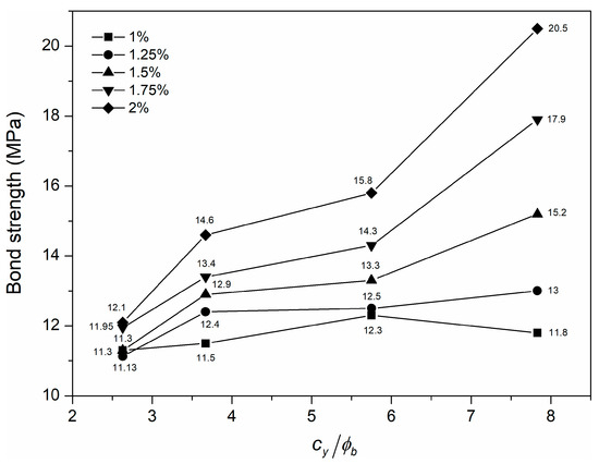 The comparison of the results in Figure 3a shows that, for different values of cy/ϕb, the bond strengths of the 12 mm bar increase with a growing basalt fibre content, and with an increasing concrete cover. The bond strengths of HPC-B0 were 11.5 MPa with the central position of the bar in the specimen and 10.5 MPa with the bar positioned halfway between the centre and the edge of the specimen and of BFRHPC provided an improvement at each volume fraction. The bond strength improvement of the 12 mm bar located axially in the specimens and pulled-out of BFRHPC ranged from 2.6% to 78.3% at the volume fractions from 1.0% to 2.0%, as well as form 12.7% to 43.1% for the eccentric pulled-out bar from BFRHPC at the same fractions. In contrast, the bond strength of the 16 mm bar falls when the fibre content is 1–1.25% (Figure 3b). The decreases ranged between 6.9% and 13.1% for an eccentric bar and reduced with higher fibre content. A similar downward trend in the range of 5.9–19.1% was maintained for the centrally located bar. Only for the 2% fibre volume fraction a slight 3.9% increase in the bond strength was noted. In the case of concrete without fibres, the bond strength was greater for the 16 mm bar in the range of 24.3–27.4%. This can be explained by the larger rib face angle between 44° to 73° of the 16 mm bar than in the 12 mm bar with a rib face angle from 37° to 73°. The lower values of bond strengths of BFRHPC for the 16 mm bar can be clarified by the larger distances between the ribs from 6 to 12 mm, compared to the 12 mm bar, in which these distances are between 3 to 6 mm. At larger distances between the lugs on the bar, the short basalt fibres could be oriented parallel to the bar between the ribs causing faster bond failure occurring, as a result of shearing off and crushing the concrete. This effect was observed for the smallest concrete cover. This indicates that the bond strength of the steel bar depends on the HPC strength. The BFRHPC compressive strength used in this study was 15–22% lower, compared to the concrete without fibres, and the splitting tensile strength was 20–50% higher.