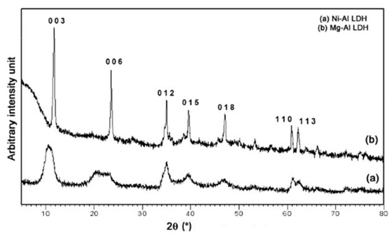PXRD patterns of (a) NiAl nitrate and (b) MgAl carbonate layered double hydroxides (LDHs). On the graph, the hkl indexes of the main reflections are superimposed.