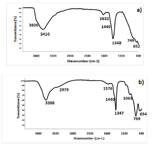 In Figure 2a,b, the FTIR spectra obtained for the synthesized compounds, the NiAl-NO3 LDH and MgAl-CO3 LDH, respectively, are shown, and the presence of the desired functional groups was confirmed.