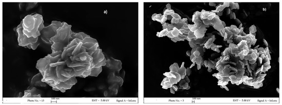 The FESEM images are shown in Figure 3a,b, and from the micrographic appearance, the two structures appear similar in morphology, showing the typical hydrotalcite structure, and the thickness of the constituent lamellae was estimated between 10 and 20 nm.