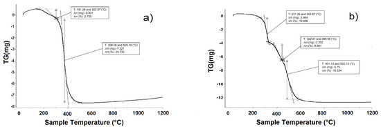 The thermogravimetric analysis, whose results are reported in Figure 4a,b, revealed that the NiAl-based LDH (Figure 4a) loses 2.7 mass% due to humidity at about 150 °C, and has a second mass decreasing at 309.3 °C, involving both the interlayer water and the nitrogen oxide for a whole amount of 24.7 mass%. The MgAl-based LDH (Figure 4b) loses mass in three steps. The first, due to humidity, at 231 °C with a mass decrease of 10 mass%, the second ascribable to the removal of the interlayer water (6.5 mass% loss at 328 °C), and the third of about 16 mass% was due to the CO2 loss, which started at about 400 °C.