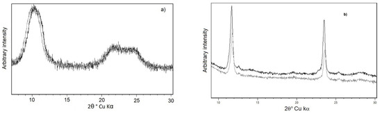 PXRD for (a) the NiAl nitrate LDH before (dark grey) and after (light grey) pollutant removal from the wastewater and (b) the MgAl carbonate LDH before (dark grey) and after (light grey) pollutant removal from the wastewater.