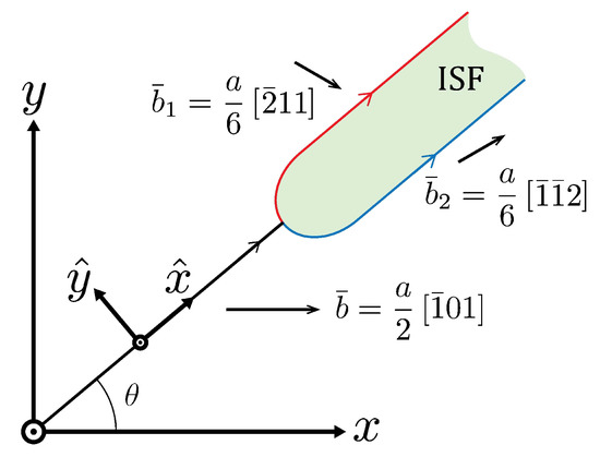 Following the setup adopted by Baudouin et al. [12], consider an orthonormal right-handed coordinate system oriented with respect to a dislocation so that the x-axis coincides with its Burgers vector and the z-axis is perpendicular to its slip plane. The angle between the Burgers vector and the line vector dictates the character of the dislocation, ranging from (screw segment) to (edge segment). If the dislocation dissociates into Shockley partials, their Burgers vectors will point at angles of from . For such a dissociated dislocation viewed from outside Thompson’s tetrahedron, an intrinsic stacking fault is achieved by placing the partials in a specific order [15,16], in this case given by and , where the subindices and refer to the leading and trailing partials, respectively. Figure 1 shows the arrangement proposed for such a dislocation and its Shockley partials.